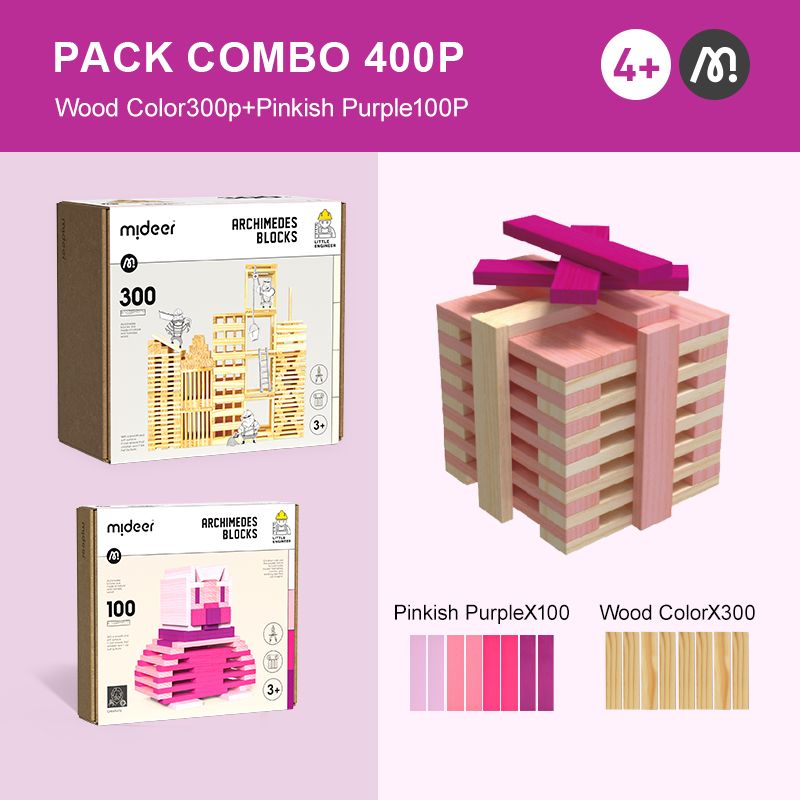 Das Set enthält 400 sorgfältig bearbeitete Holzklötze in einheitlicher Form, mit denen sich unbegrenzt viele Konstruktionen bauen lassen – von einfachen Häusern über Schiffe bis hin zu hohen Türmen oder ganzen Stadtlandschaften.