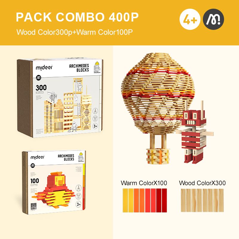 Das Set enthält 400 sorgfältig bearbeitete Holzklötze in einheitlicher Form, mit denen sich unbegrenzt viele Konstruktionen bauen lassen – von einfachen Häusern über Schiffe bis hin zu hohen Türmen oder ganzen Stadtlandschaften.